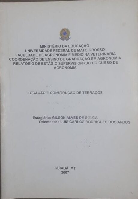 Relatório de Estágio Supervisionado do Curso de Agronomia. Terraceamento, classificação dos terraços, quarnto a função, quanto a largura da base ou faixa de terra movimentada, quanto ao processo de construção, quanto a forma do perfil do terreno, quanto ao alinhamento, levantamento preliminares para construção dos terraços, espaçamento entre terraços, fatores que afetam espaçamentos entre terraços, atividades desenvolvidas, materiais utializados.
